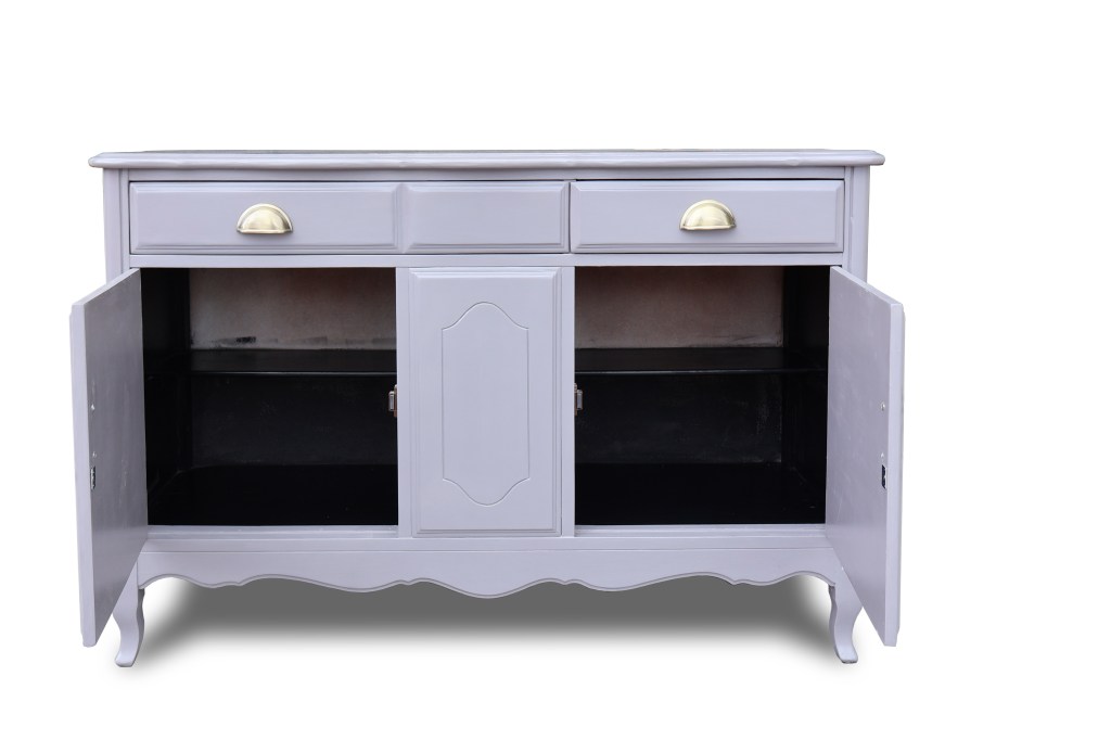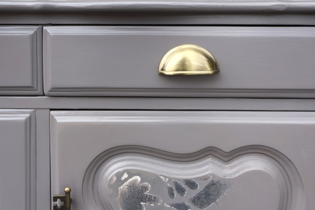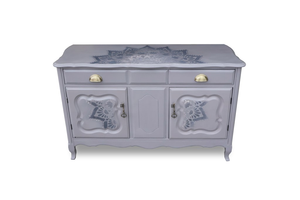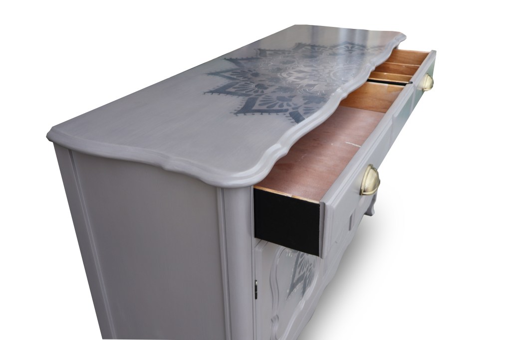 Vintage French style buffet, painted cottage grey, which is a beautiful neutral beige. The front of the cabinet doors are stenciling with the Radiance Mandela Stencil as well as to the top. The Drawer pulls are brand new, brass, cup pulls and very unique, skeleton key, door pulls.